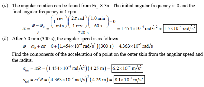 In traveling to the Moon, astron;p vkr1b 2+tvnauts aboard th4du24u k9xf b4odjj/pn eb ,w3e Apollo spacecraft put themselves into a slow rotation to distribute the Sun’s energy evenly. At tbjn/34 u f9pud4 k2woxej,4db he start of their trip, they accelerated from no rotation to 1.0 revolution every minute during a 12-min time interval. The spacecraft can be thought of as a cylinder with a diameter of 8.5 m. Determine (a) the angular acceleration, $\approx$ $rad/s^2$ (b) the radial and tangential components of the linear acceleration of a point on the skin of the ship 5.0 min after it started this acceleration. $a_{tan}$ = $ \times10^{ -4}$ $m/s^2$ $a_{rad}$ = $ \times10^{ -3}$ $m/s^2$