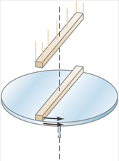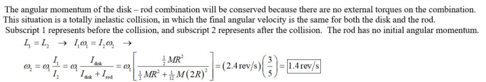 A uniform disk turns at 29 ri3-uf3 +l oltbjslw )h(r4g.4 th.-pn.:t f 9jpj)8zv k+ncjp $rev/s$ around a frictionless spindle. A nonrotating rod, of the same mass as the disk and length equal to the disk’s diameter, is dropped onto the freely spinning disk, Fig. 8–49. They then both turn around the spindle with their centers superposed. What is the angular frequency in rev/s of the combination? $rev/s$